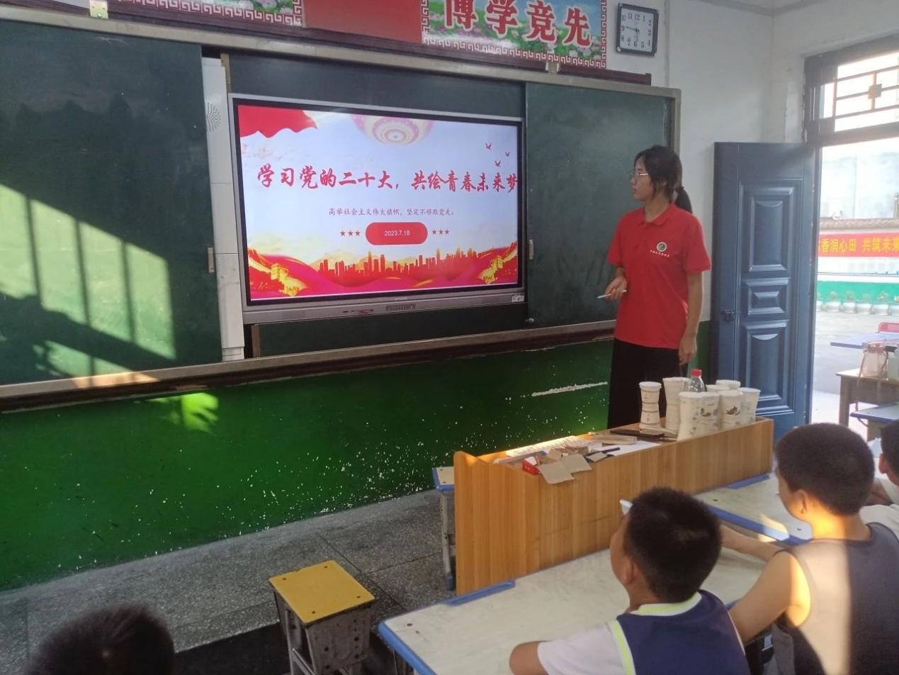 用青春筑起希望,用行动托起梦想。为深入学习习近平新时代中国特色社会主义思想,贯彻落实习近平总书记关于青年工作的重要思想,引领青少年为国家贡献青春正能量。7月18日上午,太阳成集团tyc33455cc“学思想·守初心·燃青春”筑梦服务团在平顶山市鲁山县四棵树第三小学开展了以“学习党的二十大,共绘青春未来梦”为主题的理论宣讲活动。