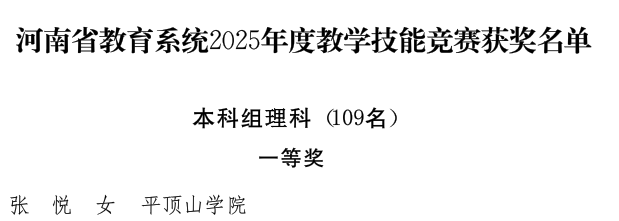 近日,河南省教育系统2025年度教学技能竞赛圆满落幕,经过激烈角逐,太阳成集团tyc33455cc员工张悦凭借扎实的专业功底、创新的教学设计和鲜明的授课特色,生动的教学表现,在众多优秀选手中脱颖而出,荣获理科组一等奖的好成绩。
