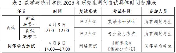 本批次调剂考生复试时间为:2026年4月9日。具体复试安排见下表2。